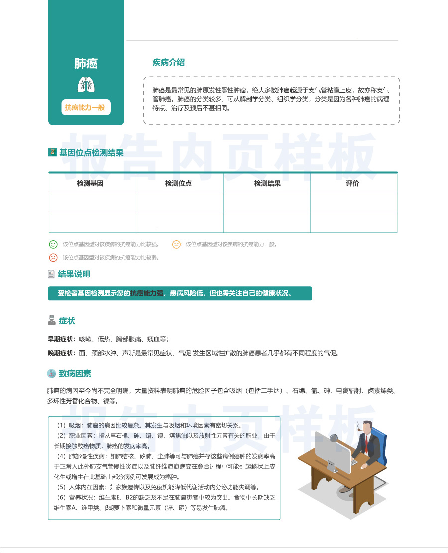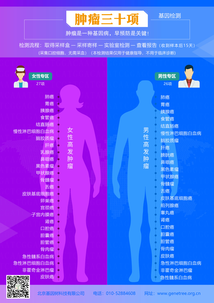 • 男女共计30项肿瘤。男26项,女27项。本检测报告只作为健康指导,不可以作为医学诊断结论。
